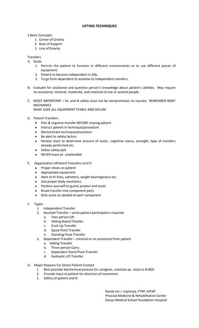 To perform this transfer carry out the following steps. Get close to the object or you plan to lift. Proper Transfer Techniques For The Health Care Professional HCA 2711 Appendix A Body Mechanics Physiology of muscular actions and functions to promote good body posture and prevent injuries 1.