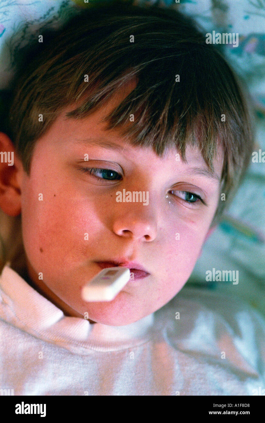 An 8 Year Old Boy With A Fever Has An Electronic Thermometer In His Stock Photo Alamy