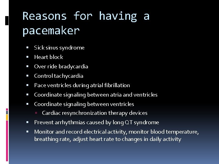 Reasons for pacemaker. Slow heart rates and cardiac pauses are the main reasons for having a pacemaker. Patients may be feel dizzy spells or even have collapsing episodes. There are a variety of causes of heart blocks including heart attacks and muscular dystrophy.